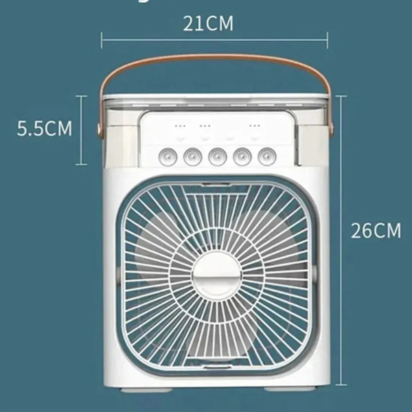 21 cm genişliğinde, 26 cm yüksekliğinde ve 5.5 cm derinliğinde olan su hazneli masa vantilatörü, hem serinletici hem de nemlendirici özelliğiyle yaz aylarında ferah bir ortam sunar. Üst kısmındaki 600 ml kapasiteli su haznesi musluk suyu ile doldurulabilir, istenirse buz da eklenerek daha serin bir etki elde edilebilir. Aynı anda 5 noktadan buhar püskürtme fonksiyonu ile geniş alanlarda etkili nemlendirme sağlar. 1 sprey ile 12 saat, 3 sprey ile 4 saat ve 5 sprey açıkken 2.5 saat kesintisiz çalışır. Taşıma sapı sayesinde kolayca taşınabilir. USB kablo ile çalışır ve farklı iç mekânlarda kullanıma uygundur. Klima gibi kuru hava yaratmaz, ortamın nem dengesini korur. Özellikle ev, ofis, yatak odası ve bebek odası gibi alanlarda tercih edilir.